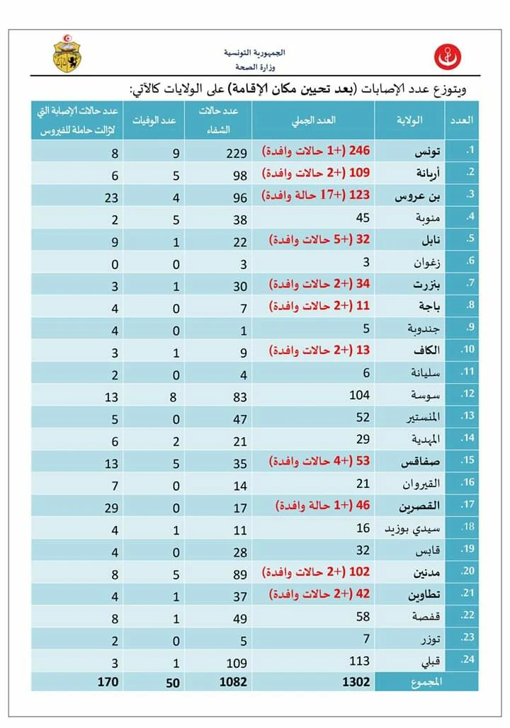 1082 حالة شفاء و50 حالة وفاة و170 حالة إصابة لا تزال حاملة للفيروس وهي بصدد المتابعة.