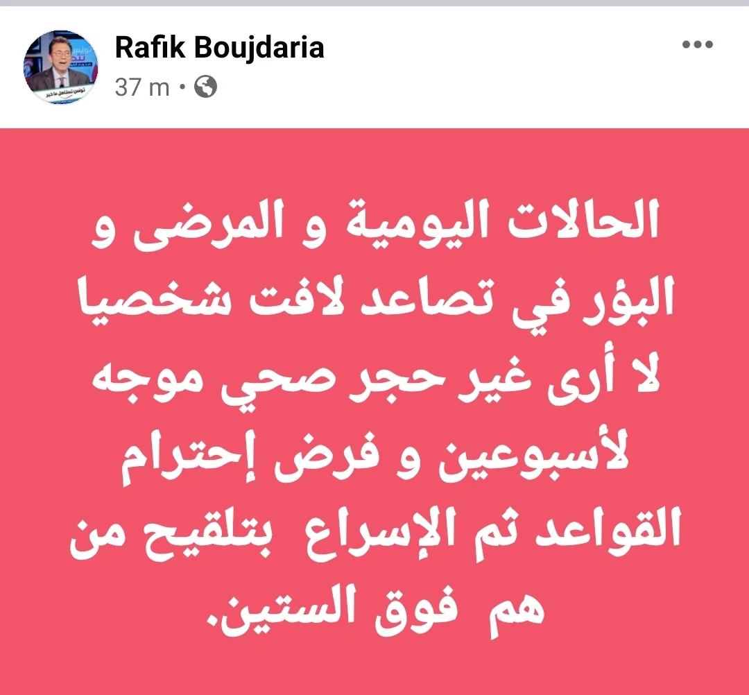 وأضاف بوجدارية، في تدوينة على صفحته بالفايسبوك، "شخصيا لا أرى غير حجر صحي موجه لأسبوعين وفرض إحترام القواعد ثم الإسراع بتلقيح من هم فوق الستين".