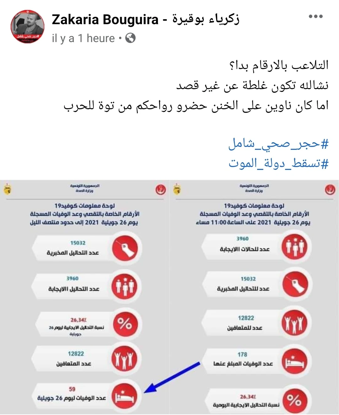 الصفحة الرئيسيةأخبار د. زكريا بوقيرة يعلق على التلاعب بأرقام وفيات كورونا.. “حضرو رواحكم من توة للحرب” (صور) byموزاييك نيوز -يوليو 28, 2021 0 حذّر الدكتور زكريا بوقيرة، اليوم الأربعاء 28 جويلية 2021، وزارة الصحة من التلاعب بأرقام وفيات كورونا.وقد نشر بوقيرة، على صفحته الرسمية بفايسبوك، بلاغ وزرة الصحة والذي تضمن 178 وفاة قامت بمحوه ثم نشر بلاغ آخر يحتوي على 59 وفاة فقط.وقال زكريا بوقيرة في ذاتوالتدوينة “التلاعب بالارقام بدا؟ نشالله تكون غلطة عن غير قصد .. اما كان ناوين على الخنن حضرو رواحكم من توة للحرب” Tags أخبار