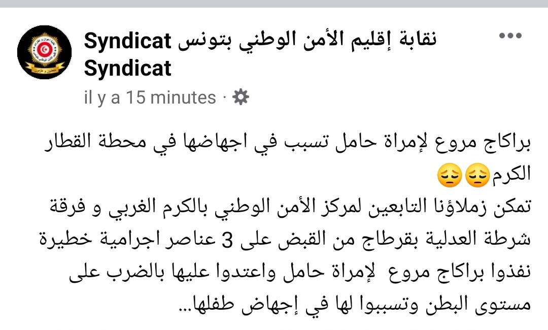 و اوضحت النقابة أن أعوان المركز الأمن الوطني بالكرم الغربي و فرقة شرطة العدلية بقرطاج تمكنوا من القبض على 3 أشخاص قاموا بالاعتداء على امرأة بالضرب على مستوى البطن ما تسبب لها في إجهاض طفلها.