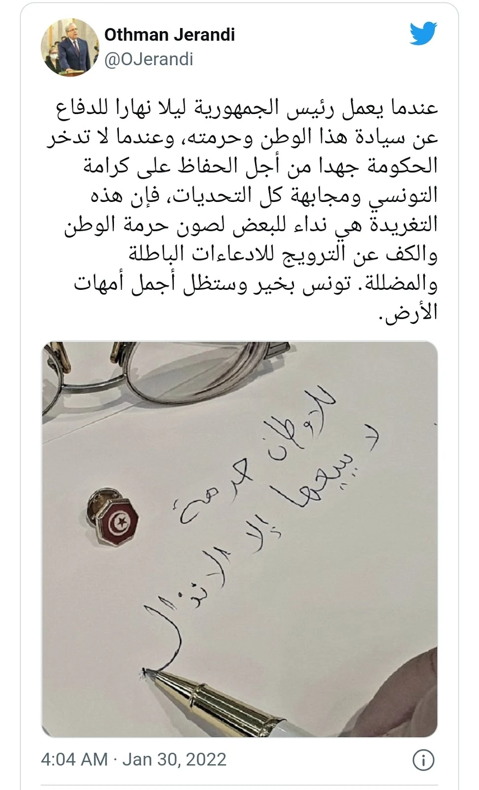 "عندما يعمل رئيس الجمهورية ليلا نهارا للدفاع عن سيادة هذا الوطن وحرمته، وعندما لا تدخر الحكومة جهدا من أجل الحفاظ على كرامة التونسي ومجابهة كل التحديات، فإن هذه التغريدة هي نداء للبعض لصون حرمة الوطن والكف عن الترويج للادعاءات الباطلة والمضللة. تونس بخير وستظل أجمل أمهات الأرض".
