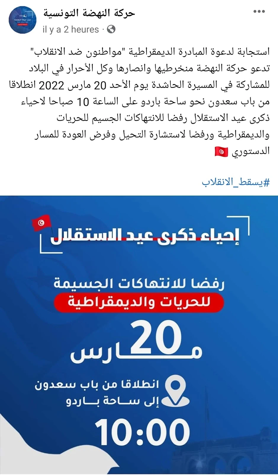 استجابة لدعوة المبادرة الديمقراطية "مواطنون ضد الانقلاب" تدعو حركة النهضة منخرطيها وانصارها وكل الأحرار في البلاد للمشاركة في المسيرة الحاشدة يوم الأحد 20 مارس 2022 انطلاقا من باب سعدون نحو ساحة باردو على الساعة 10 صباحا لاحياء ذكرى عيد الاستقلال رفضا للانتهاكات الجسيم للحريات والديمقراطية ورفضا لاستشارة التحيل وفرض العودة للمسار الدستوري.