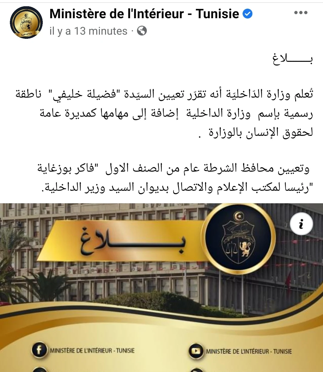 تُعلم وزارة الدّاخليّة أنه تقرّر تعيين السيّدة “فضيلة خليفي” ناطقة رسمية بإسم وزارة الداخلية إضافة إلى مهامها كمديرة عامة لحقوق الإنسان بالوزارة .