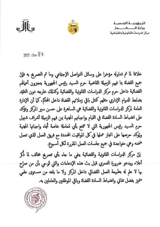 كما أكد حرصها على “انجاز عملها في كل المواقيت المحددة مع فريق العمل الذي تعمل ضمنه وهي متواجدة في جميع جلسات العمل المقررة لكل أسبوع” ،و دعا المركز إلى ضرورة التحرّي قبل بث الإدعاءات التي توحي بأن من صرّح بها لا علم له بطبيعة عمل القضاة داخل المركز”.