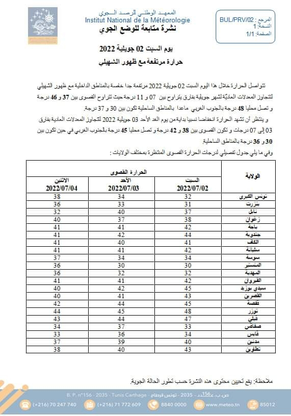 أفاد المعهد الوطني للرصد الجوي، في بلاغ اليوم السبت 2 جويلية 2022، بتواصل ارتفاع الحرارة خاصة في المناطق الداخلية مع ظهور الشهيلي لتتجاوز المعدلات العادية لشهر جويلية بفارق يترواح بين 7 و11 درجة حيث تتراوح القصوى بين 37 و46 درجة وتصل محليا إلى 48 درجة في الجنوب الغربي ما عدا في المناطق الساحلية تكون بين 30 و37 درجة.