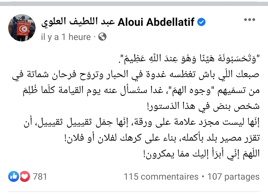 في تدوينة نشرها على صفحته الرسمية بموقع التواصل الاجتماعي فايسبوك، عدد عبد اللطيف العلوي، المواطنيين الذين سوف يصوتون بنعم غدا على الدستور بأنهم سيسألون عنه يوم القيامة.. عن ذلك، وفق قوله.