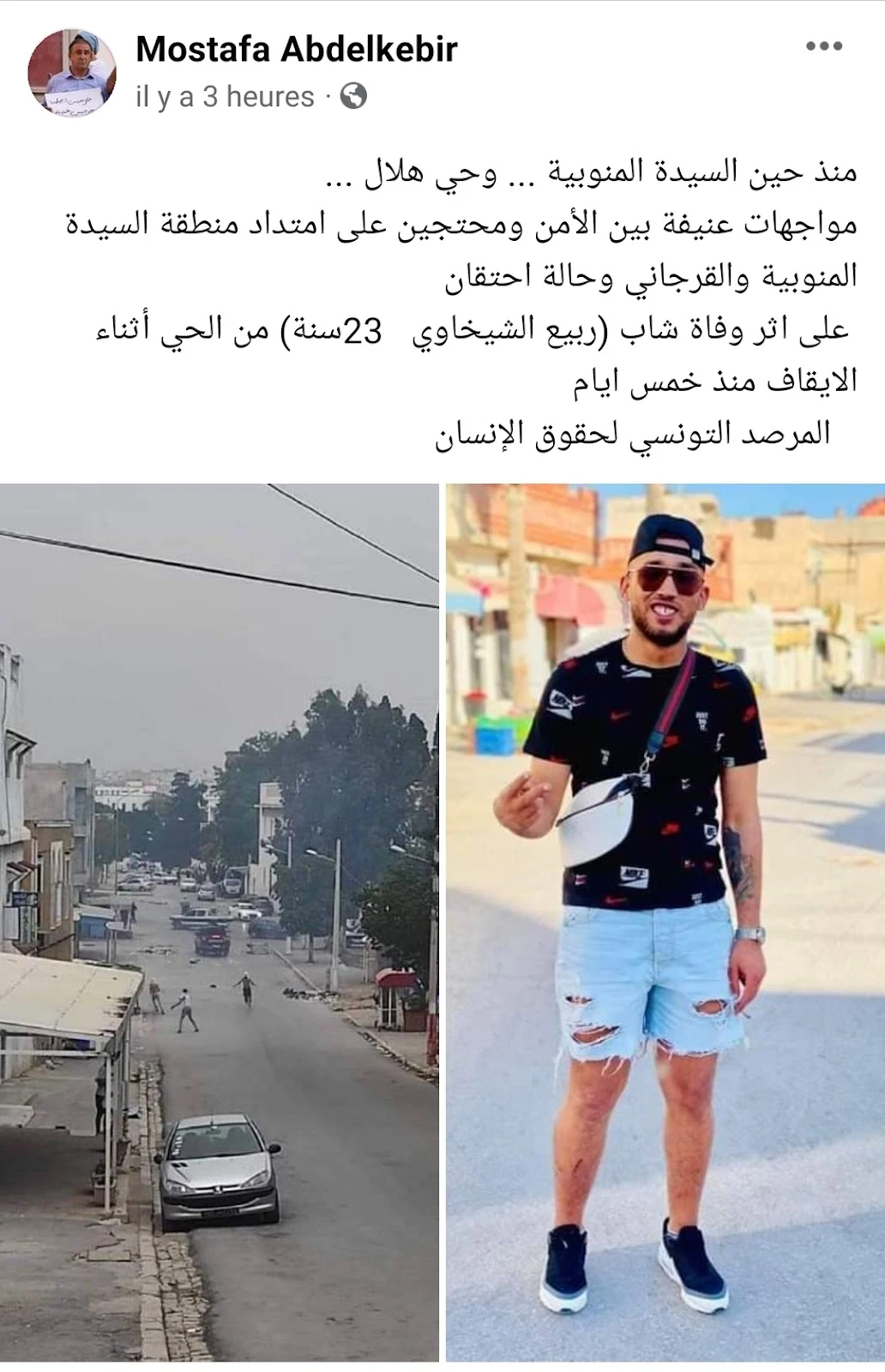 شهدت منطقة السيدة المنوبية وحي هلال اندلاع مواجهات بين قوات الأمن ومحتجين من المنطقة تزامنا مع تشييع جنازة الشاب ربيع الشيحاوي