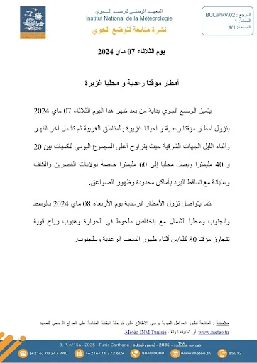 يتميز الوضع الجوي بداية من بعد ظهر هذا اليوم الثلاثاء 07 ماي 2024 بنزول أمطار مؤقتا رعدية و أحيانا غزيرة بالمناطق الغربية ثم تشمل آخر النهار و أثناء الليل الجهات الشرقية،
